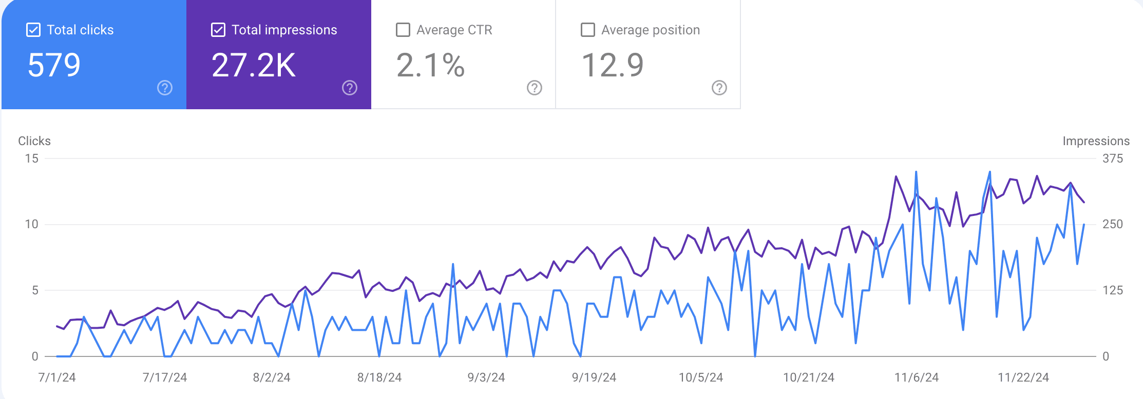 This graph from Google Search Console shows the blog performance in the last 5 months. On the left is the number of clicks and the right is impressions. The blue line is measuring clicks and the purple line is measuring impressions. In July the blog was getting 43 clicks and 2.39K impressions. By the end of November, it reached 230 clicks and 8.9K impressions.